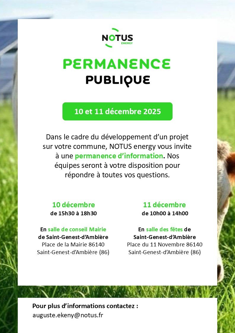 Dans le cadre du développement d'un projet sur la commune, NOTUS Energy organise une permanence d'information pour échanger et répondre à vos questions.