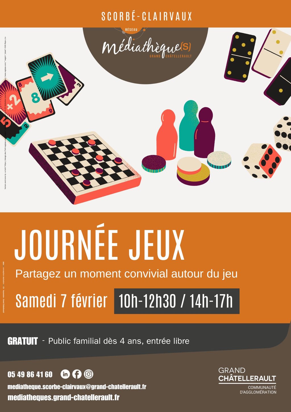 Venez partager un moment convivial autour du jeu en solo, en duo ou en groupe le samedi 7 février 2026 de 10h à 12h30 et de 14h à 17h à la médiathèque de Scorbé-Clairvaux située près de la mairie.