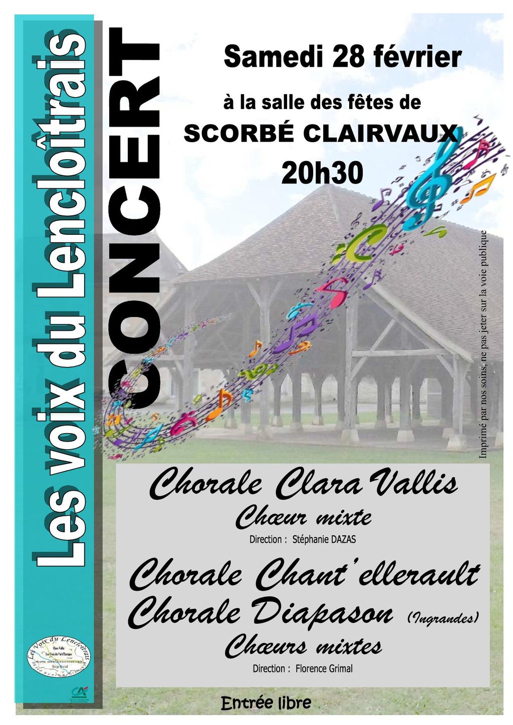 La chorale Claravallis invite les chorales Diapason d'Ingrandes et Chant'ellerault pour un concert à la salle des fêtes de Scorbé Clairvaux le 28 février à 20h30