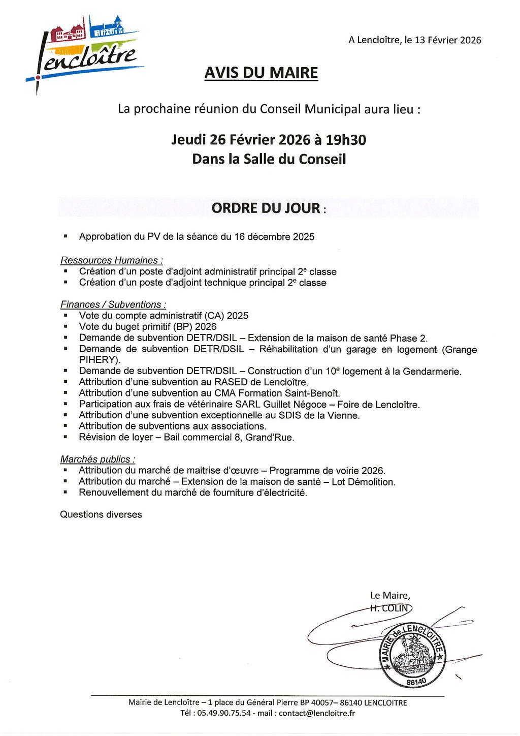 Avis du Maire - Réunion de Conseil Municipal