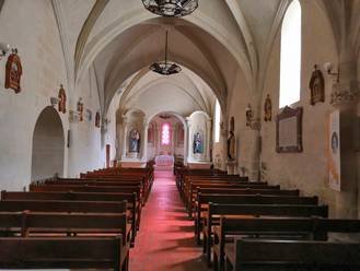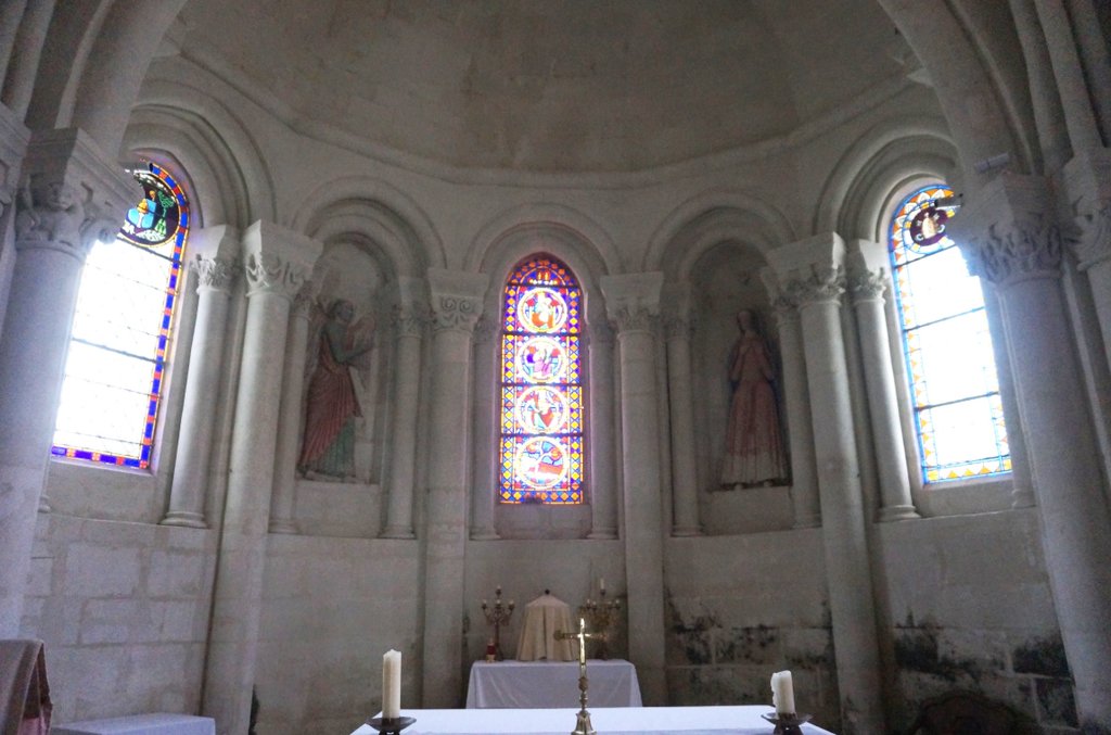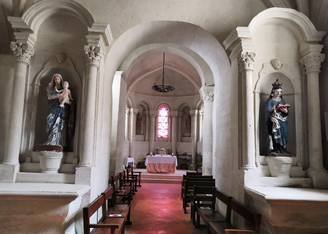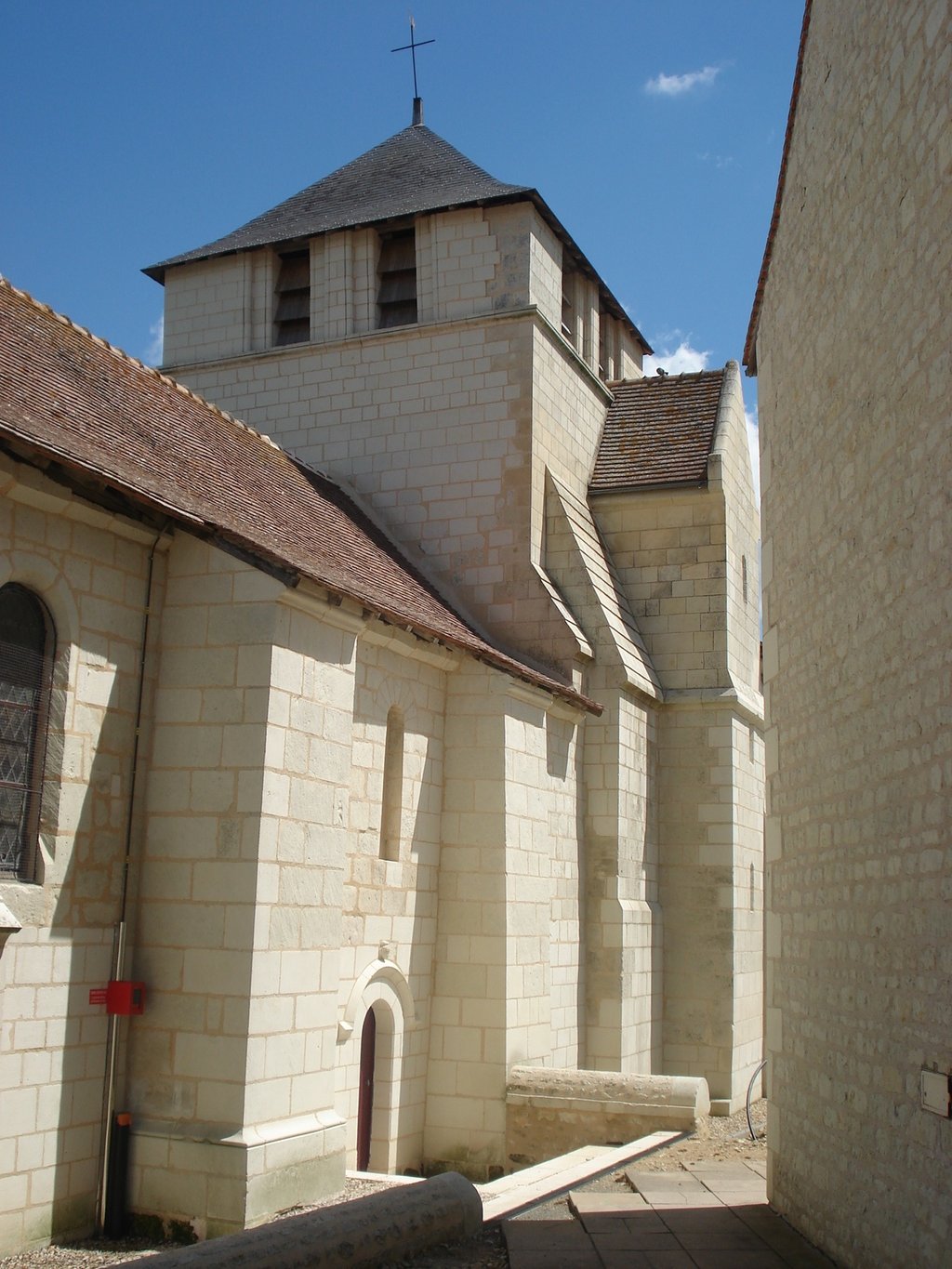 L'église se compose d'une nef unique de quatre travées voûtées sur croisée d'ogives ; une travée carrée sous le clocher couverte d'une voûte d'ogives à liernes ; une travée droite de choeur voûtée d'ogives ; une abside en hémicycle surmontée d'un cul de four à cinq pans. L'abside est décorée d'une arcature continue dans laquelle s'inscrivent trois fenêtres séparées par deux arcades aveugles. Fenêtres et arcatures comportent des colonnettes, ornées de chapiteaux à feuilles d'acanthes ou animaux fantastiques. La fenêtre percée au sud est une addition du 15e siècle, comme l'indique son réseau flamboyant. La travée carrée située entre le choeur et la nef, sur laquelle repose le clocher, est limitée par des arcades à double rouleau. La voûte date du 15e siècle. Les murs de la nef unique semblent appartenir à une campagne de construction plus ancienne que celle de l'abside. A l'intérieur, le vaisseau a complètement été rhabillé au 15e siècle. Dans les arcatures aveugles de l'abside se trouvent deux personnages en haut relief représentant une Annonciation grandeur nature avec, à gauche, l'angle Gabriel et, à droite, la Vierge. Cette oeuvre pourrait remonter au 13e siècle.